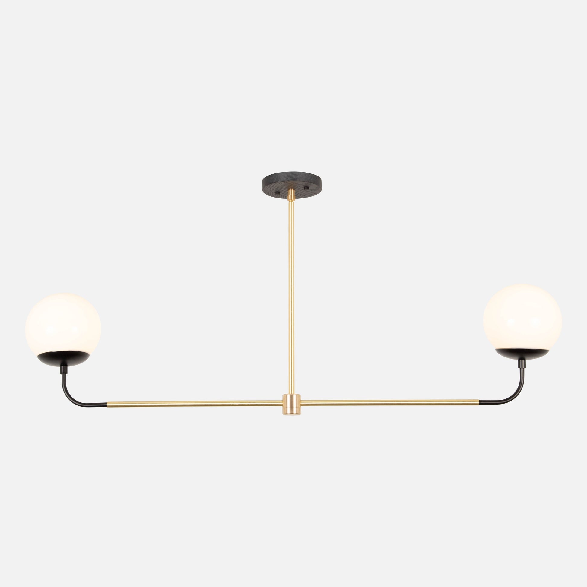 A simple yet striking chandelier featuring a duo of glass globe shades and slim profile suitable for kitchens, dining rooms and bedrooms alike. Choose from our pallet of material combinations for infinitely versatile look and feel
