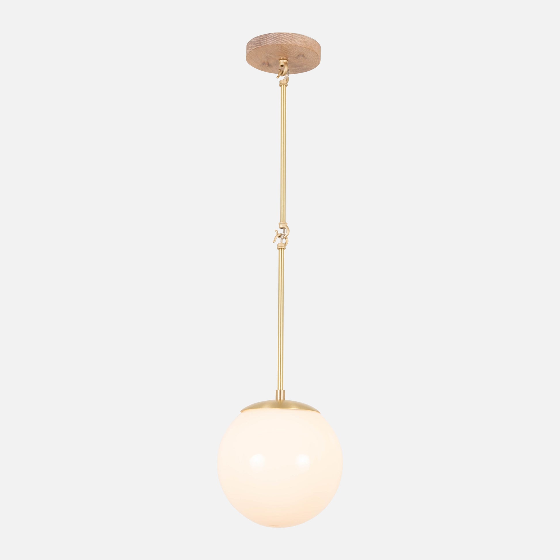 A pendant light with vintage appeal featuring a large, glass globe and handcrafted wooden canopy.