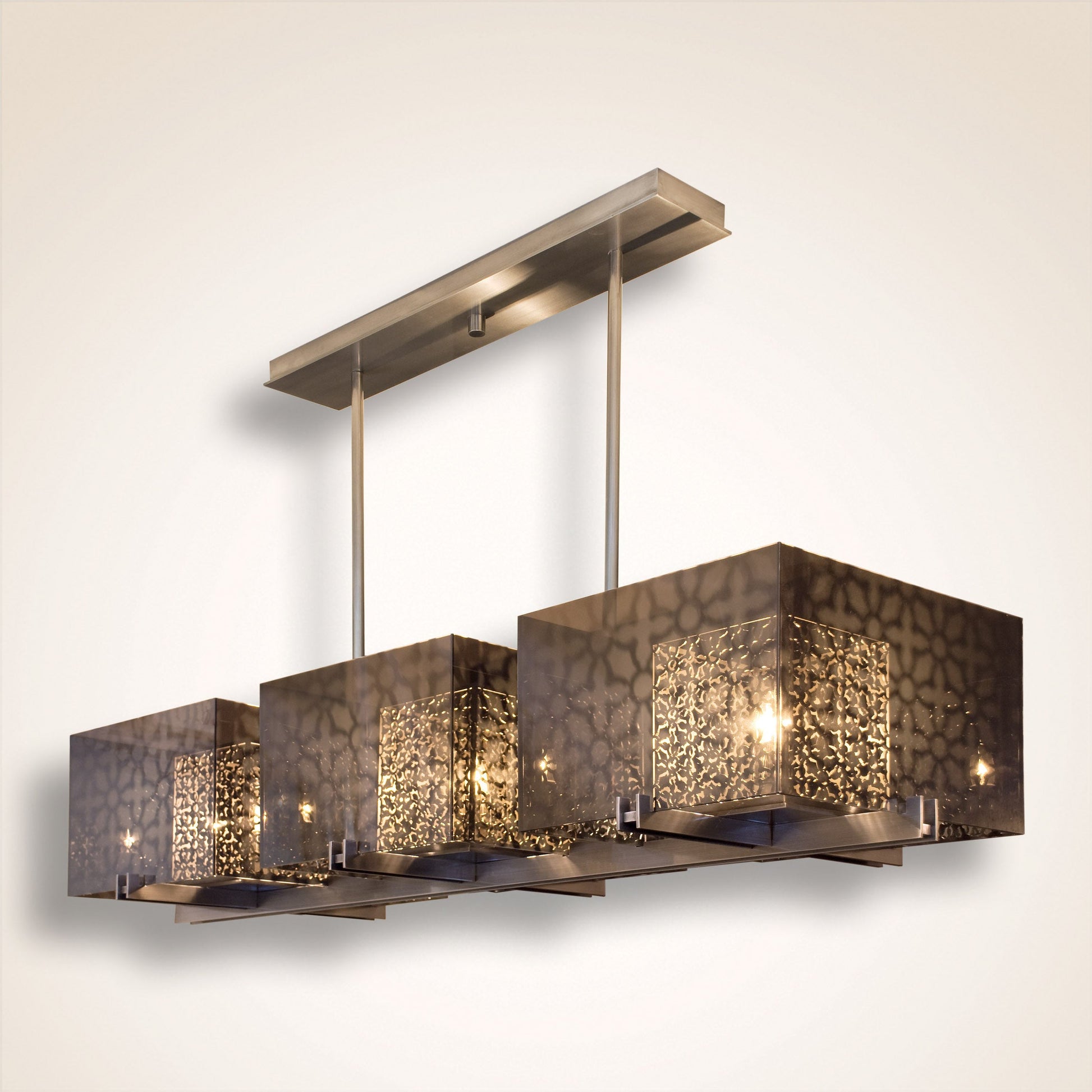 FINISH Plated Pewter Frame with Natural Lacquered Steel Laser Custom Shade and Bronze Acrylic Box Diffusers
