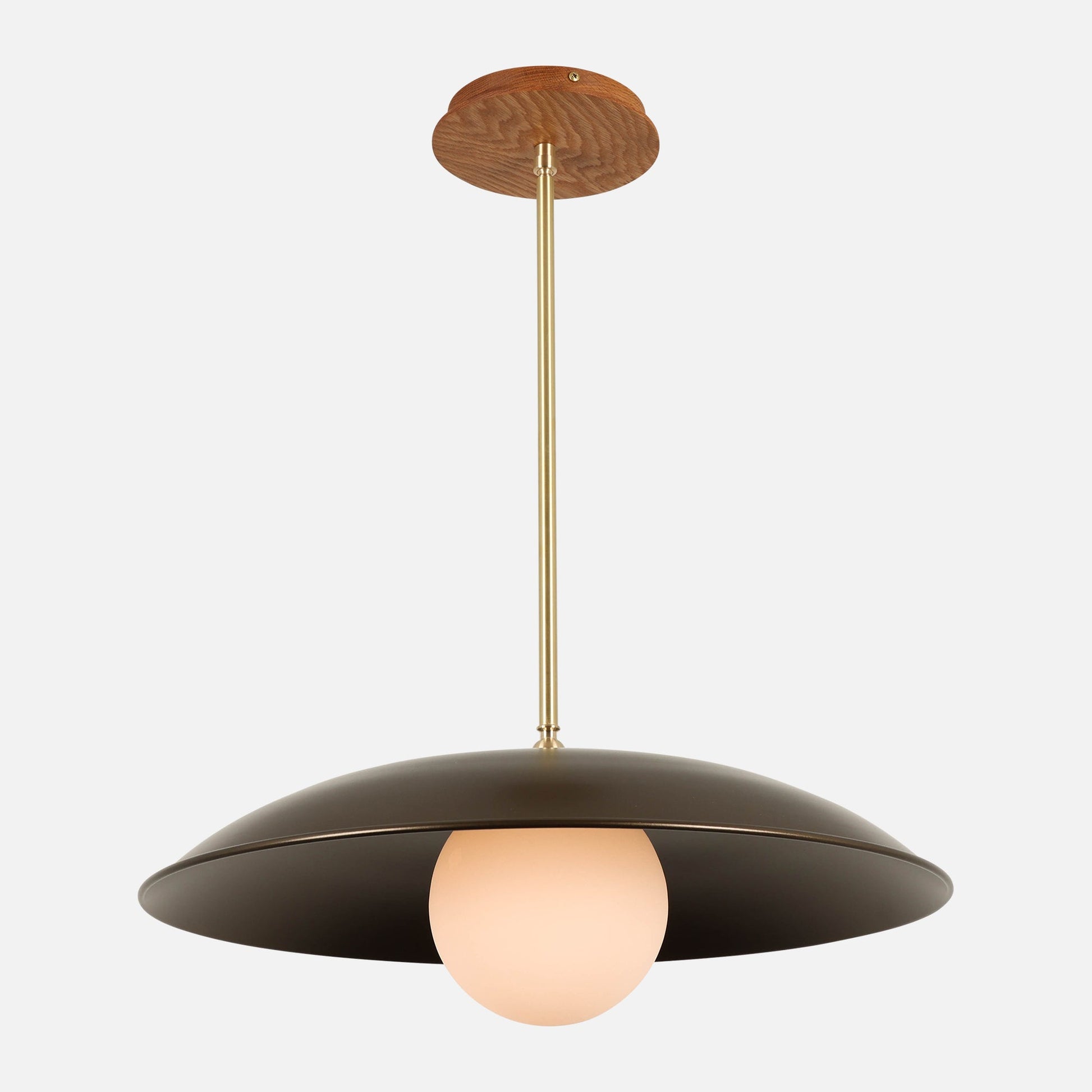 An elegant pendant light with a striking profile, this light features a softy curving shade and other rounded details. The glass globe diffuses its brightness for a gentle glow.