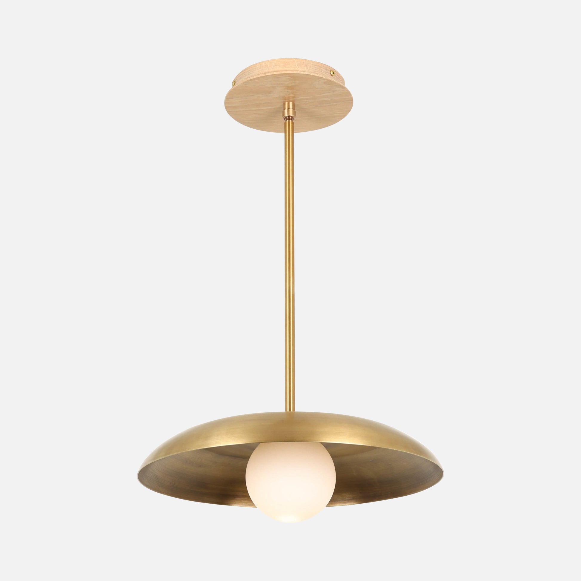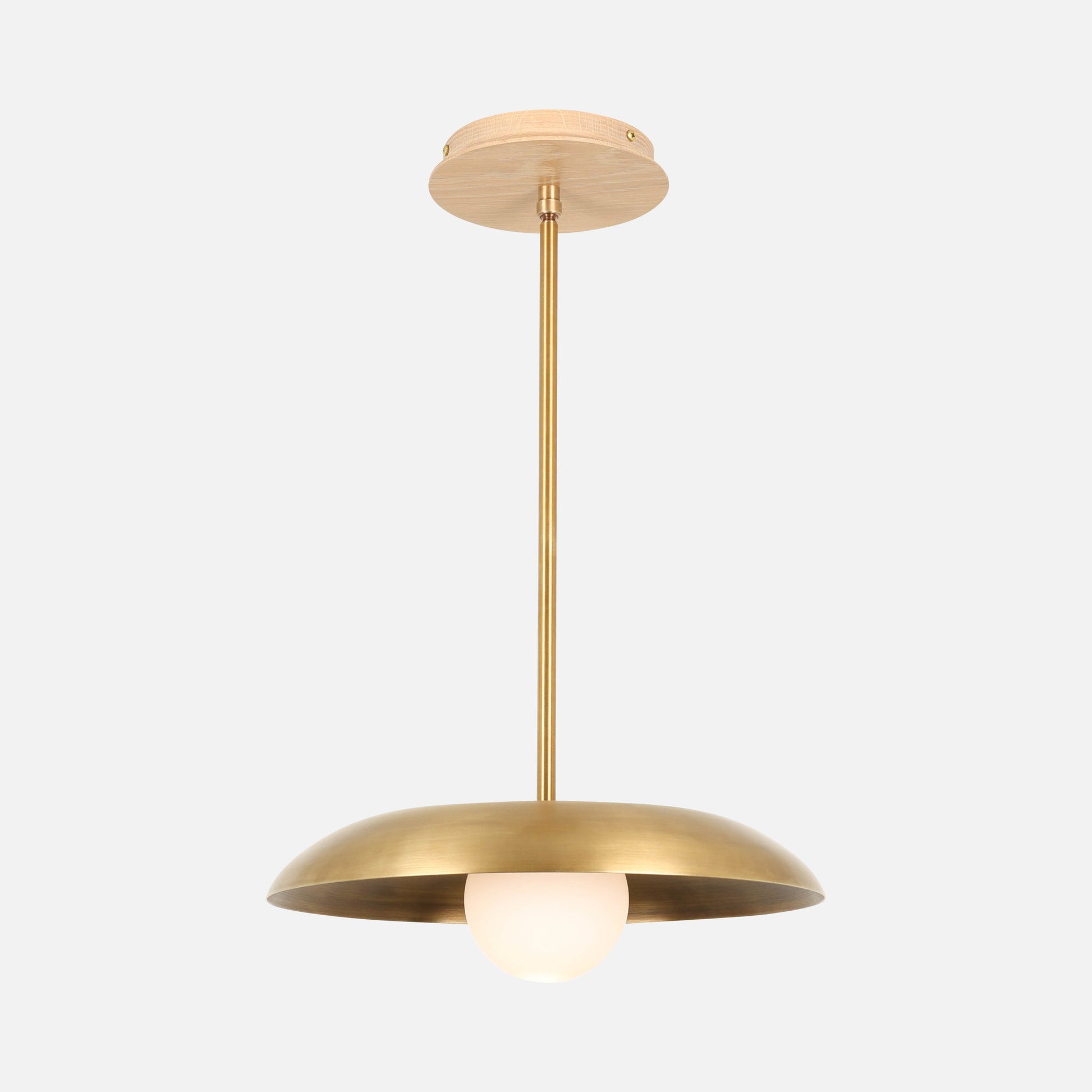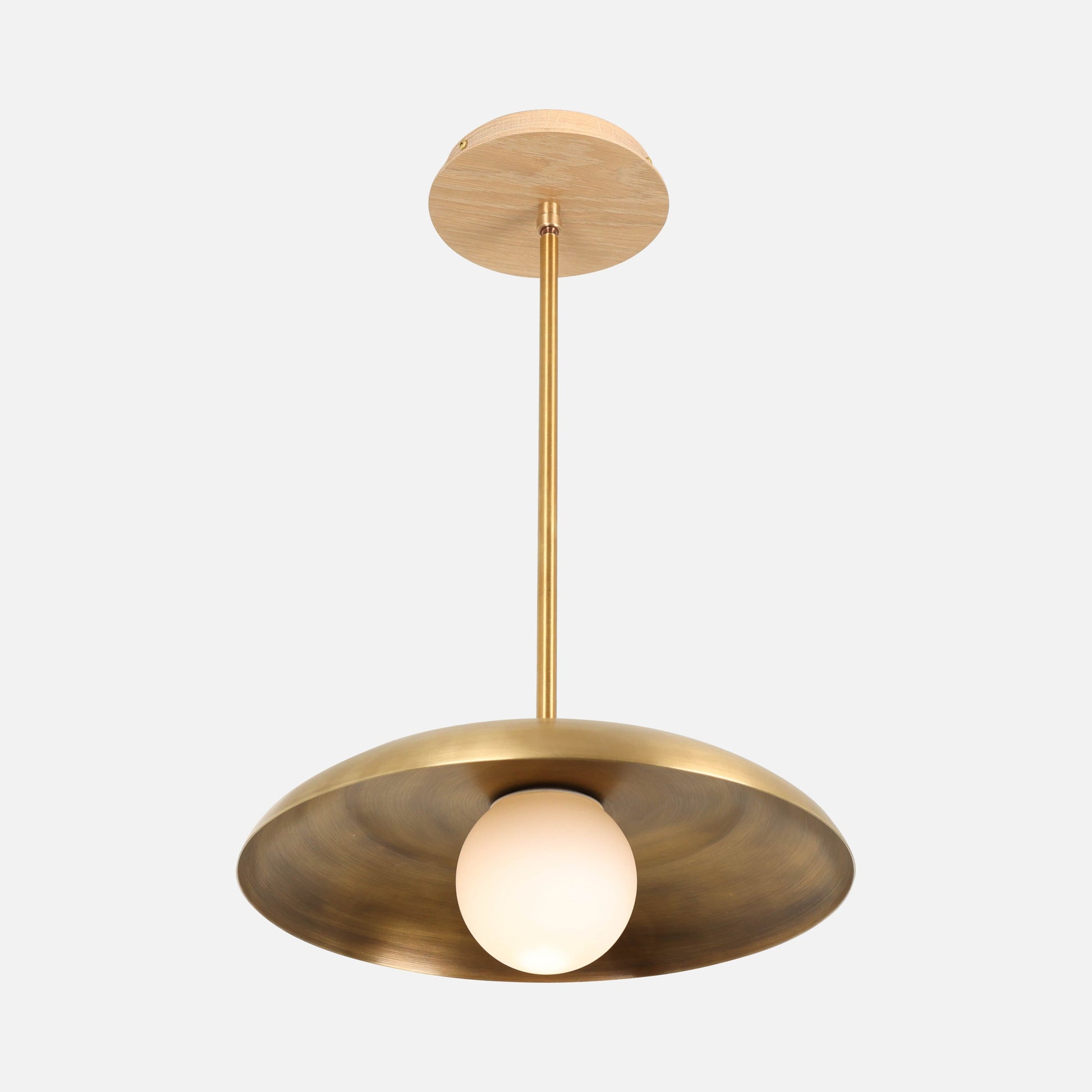 This pendant light is sleek and refined featuring a spun metal shade and petite opal glass globe for soft diffused light. Paired with a signature hardwood canopy, the Jessamine Pendant combines the perfect mix of materials that will read will in any room.