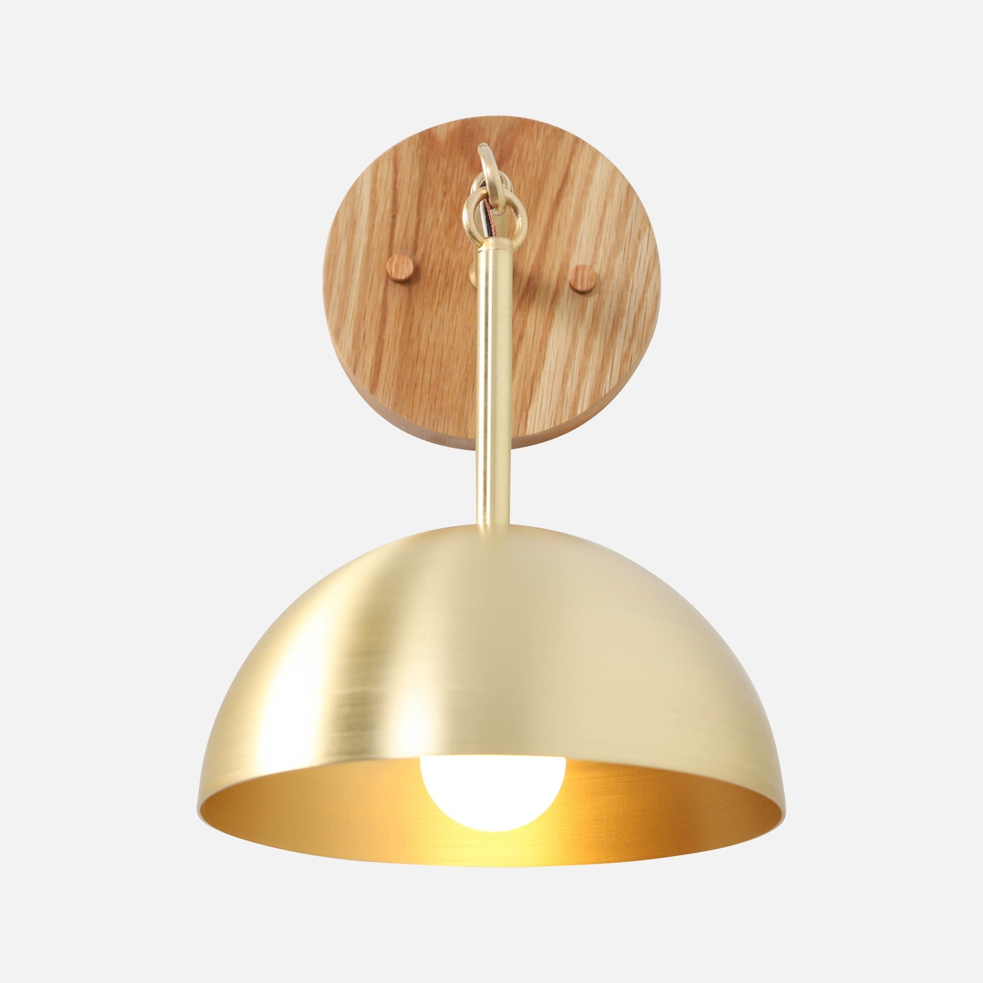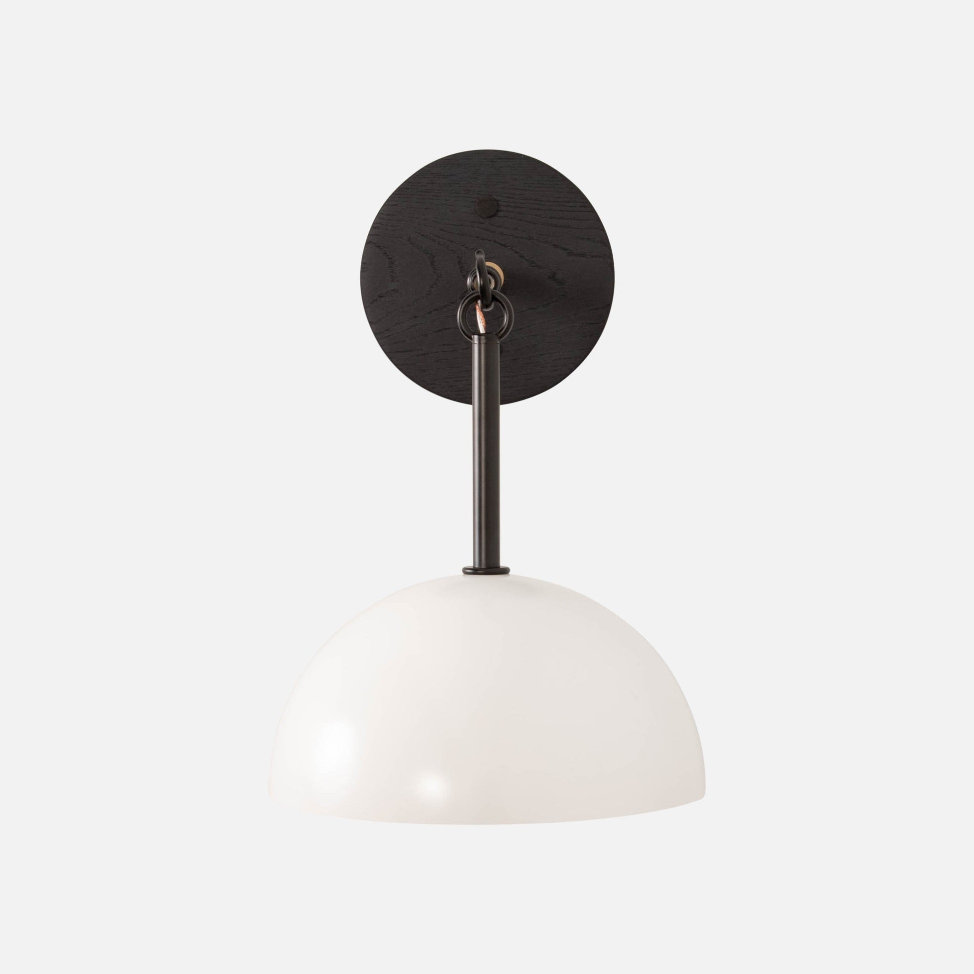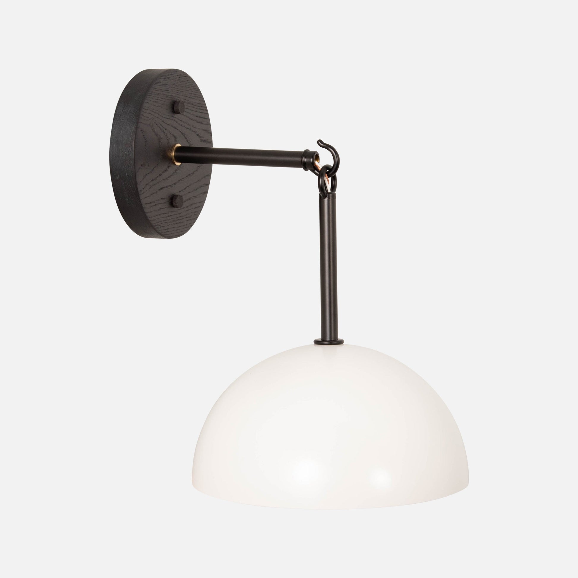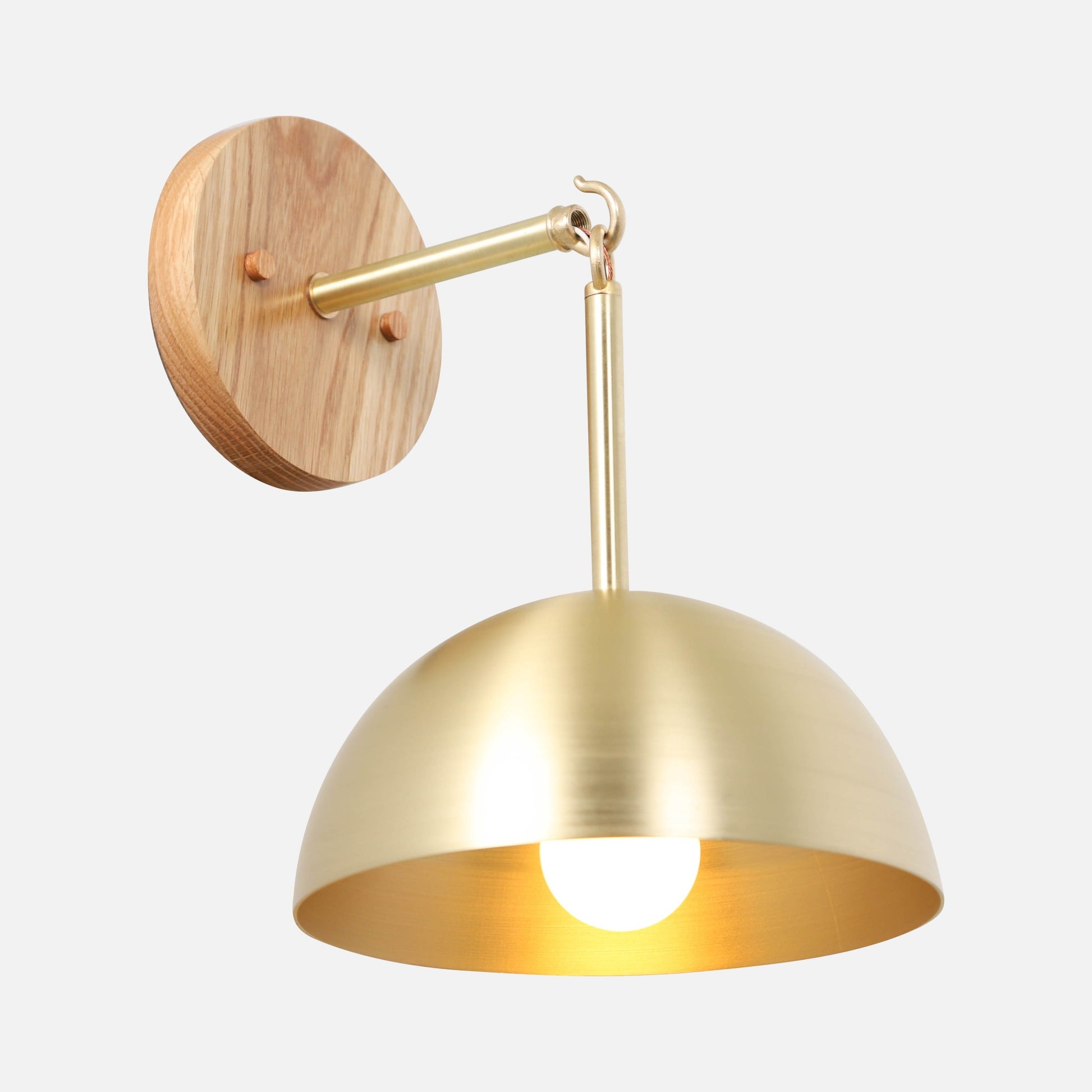 A curved dome shade, bench-made wooden canopy and traditional hook details combine to create a stylish wall sconce that reads well in any space.