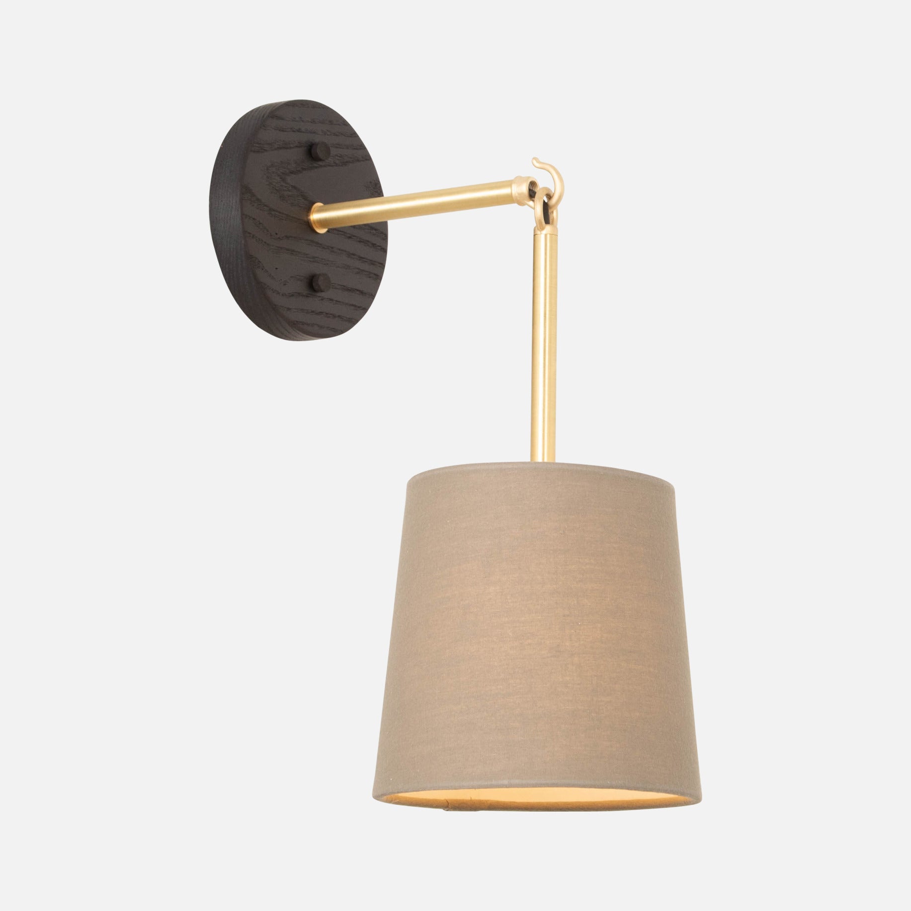 A crisp linen shade, bench-made wooden canopy and traditional hook details combine to create a stylish wall sconce that reads well in any space.