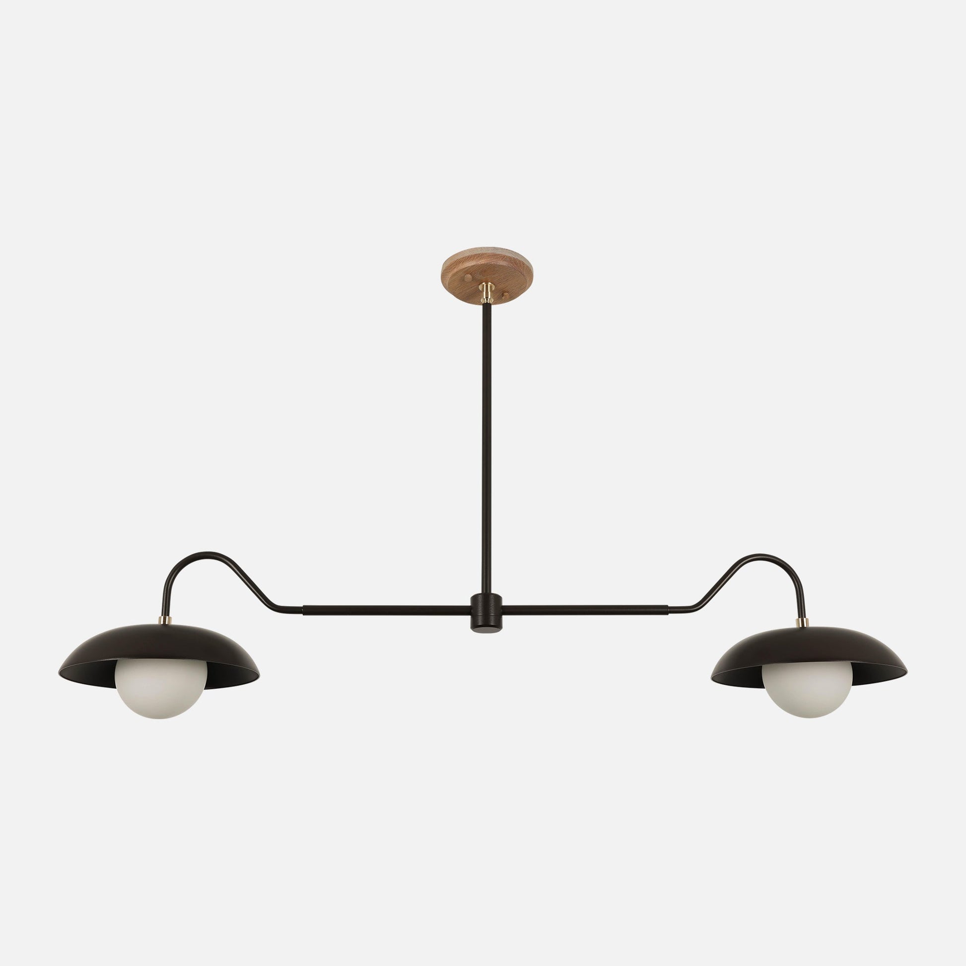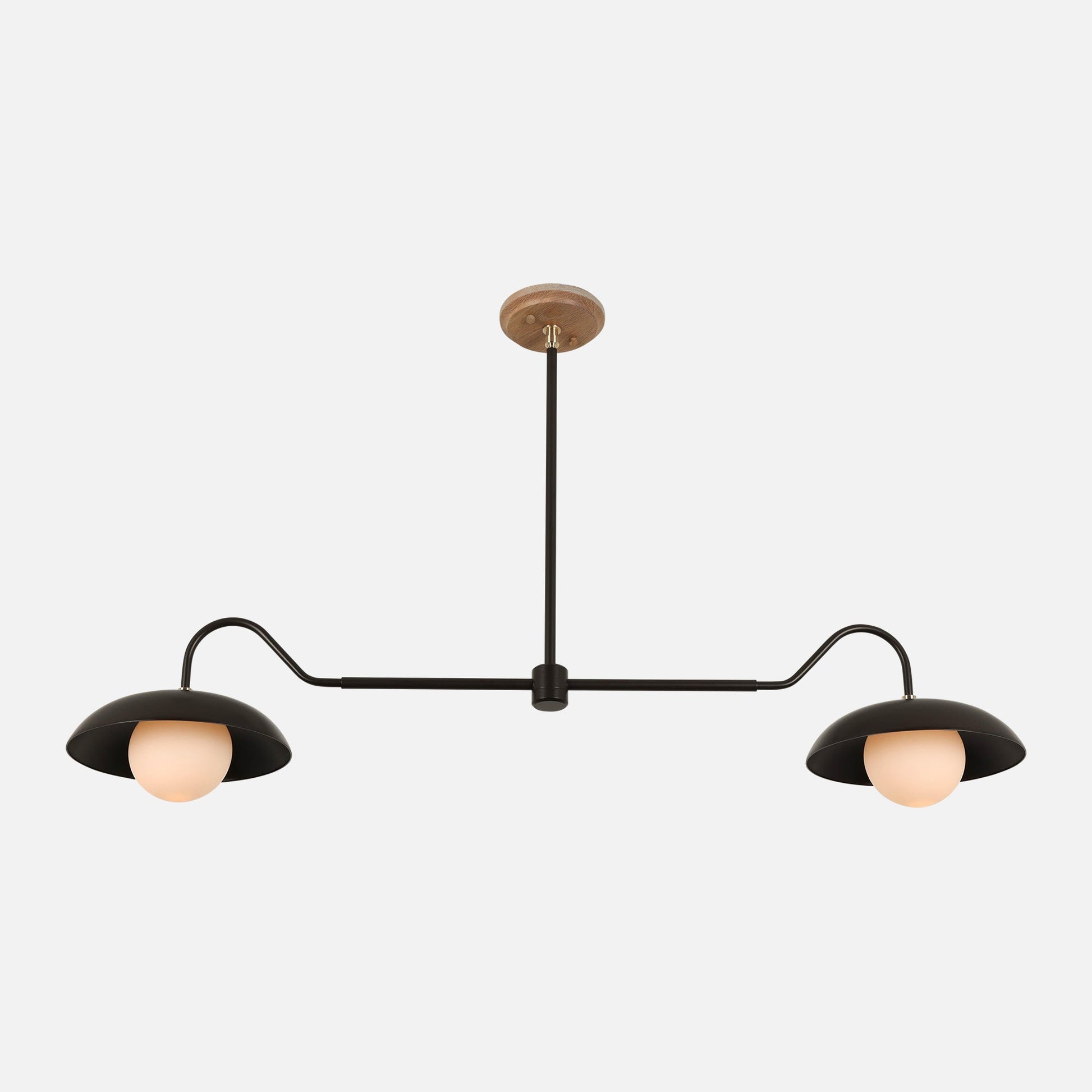 Inspired by traditional store-front sconces, this charming pendant combines 2 shallow, spun dome shades and glass diffusers, gracefully arcing arms and bench-made wooden canopy to add vintage appeal to any space. With its timeless, modern style, it will read well in any room.
