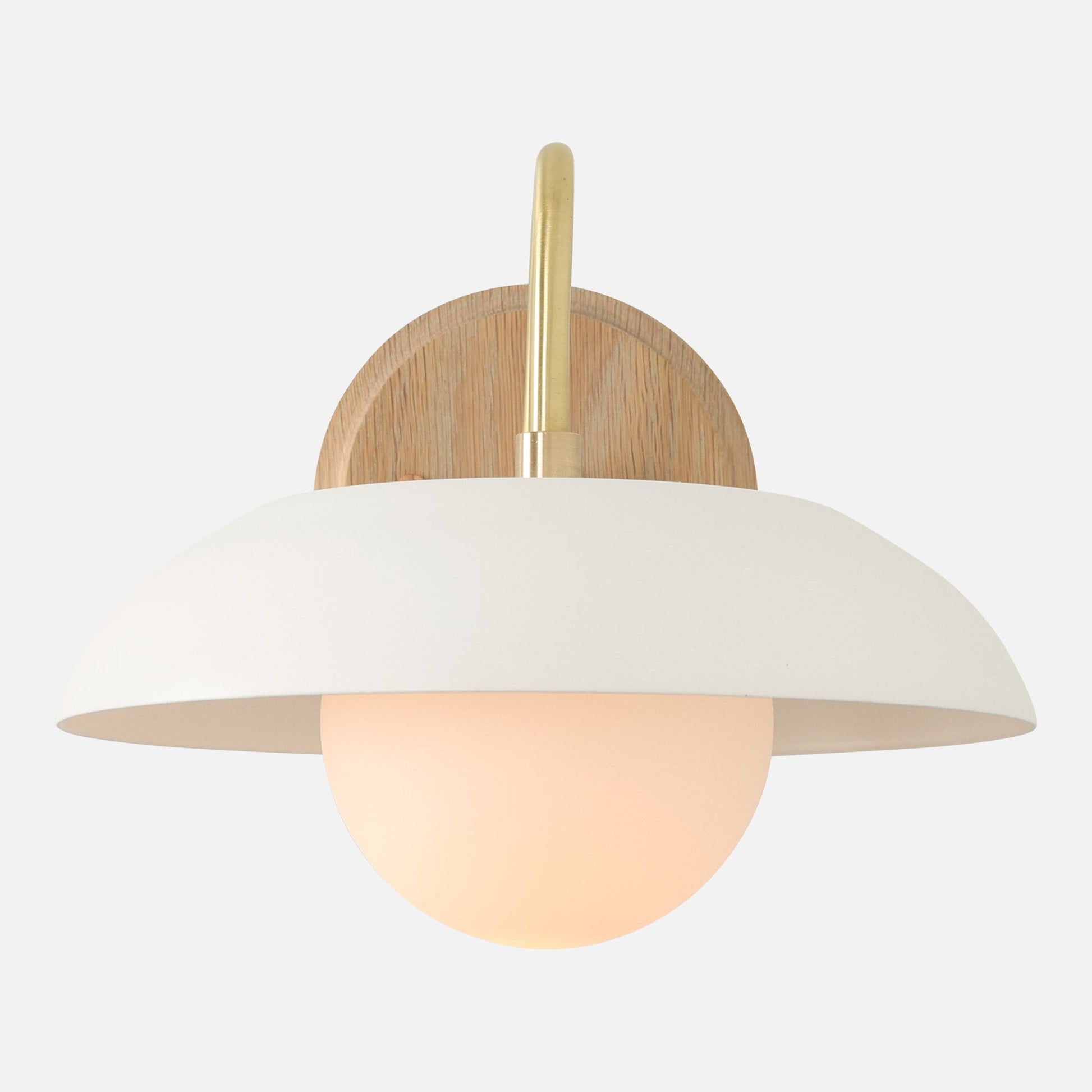 Inspired by traditional store-front sconces, this charming lamp combines a shallow, spun dome shade and glass diffuser, gracefully arcing arm and bench-made wooden canopy to add vintage appeal to any space. With its timeless, modern style, it will read well in any room.