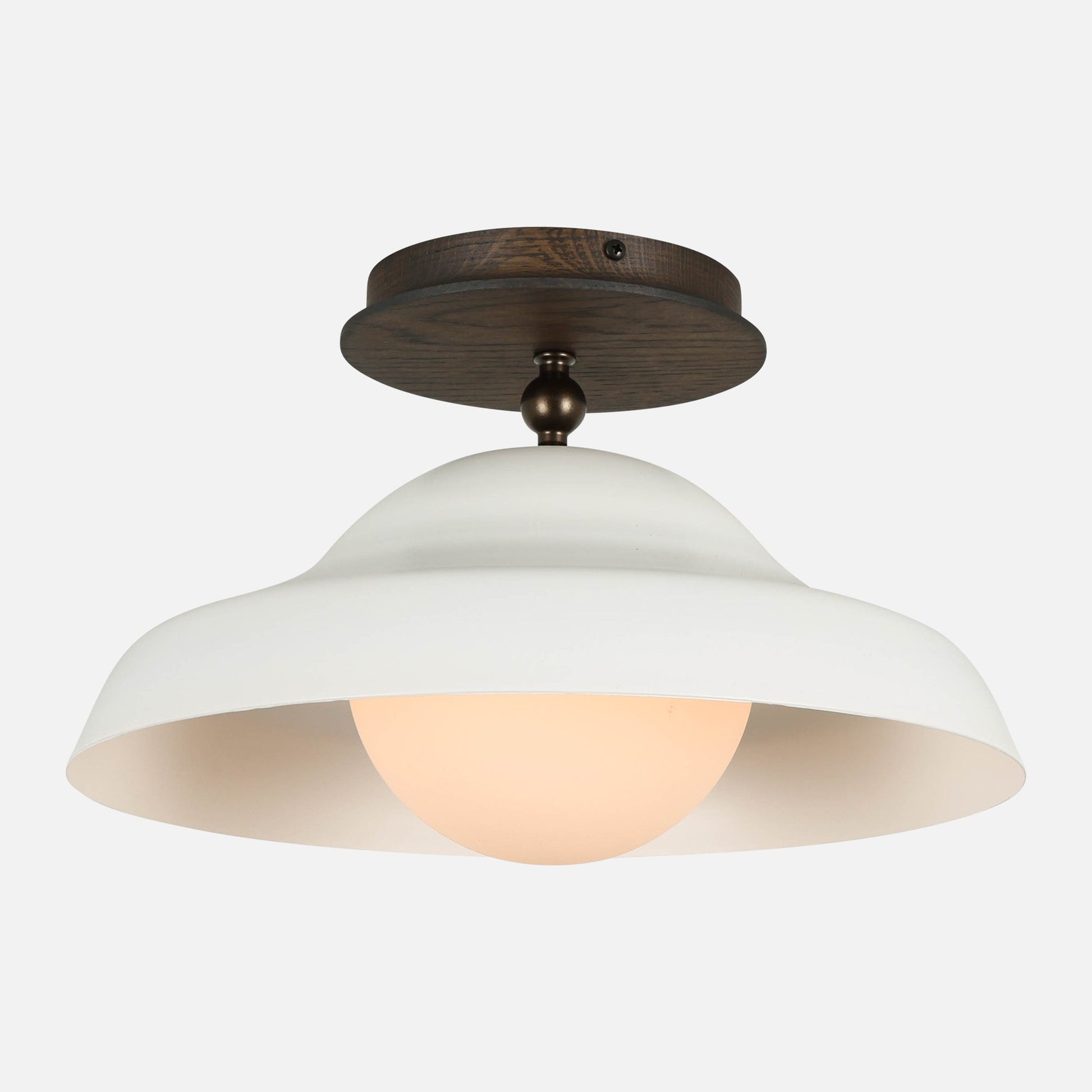 An elegant flush mount with a striking profile, this light features a softy curving shade and other rounded details. The glass globe diffuses light for a gentle glow.