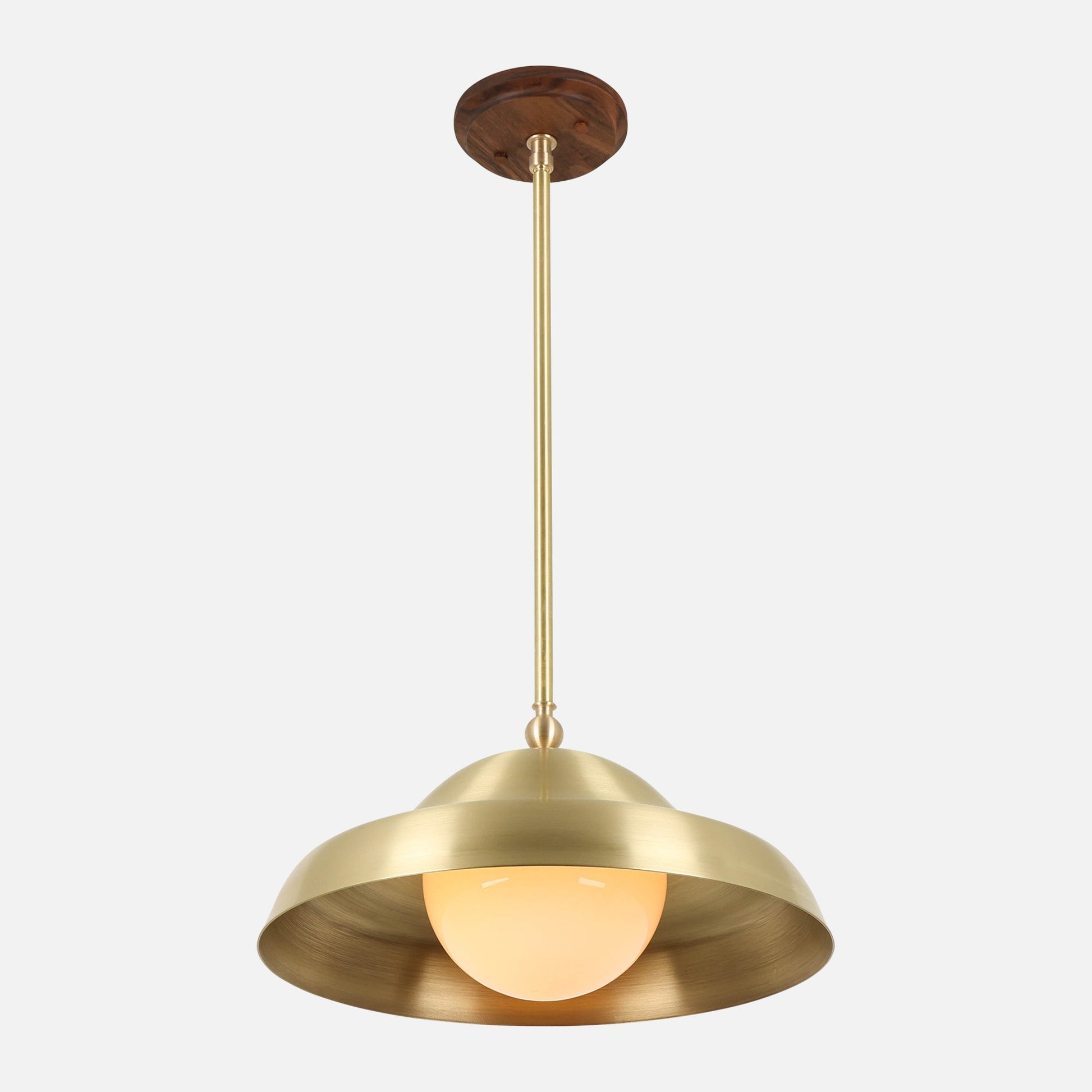 An elegant pendant light with a striking profile, this light features a softy curving shade and other rounded details. The glass globe diffuses its brightness for a gentle glow.