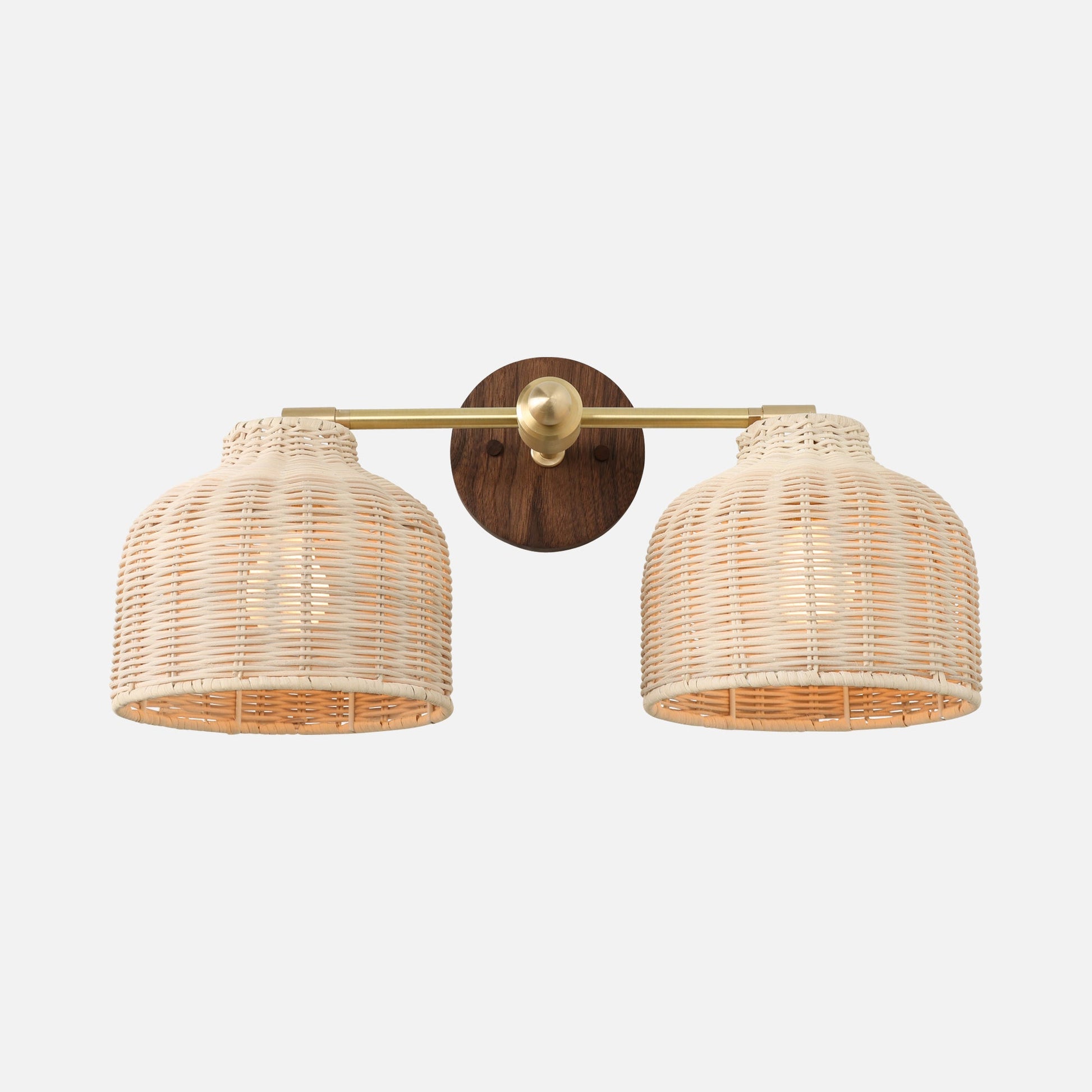 Two curvy rattan shades compliment streamlined, metal arms and a unique wooden canopy for a wall sconce brimming with charm.