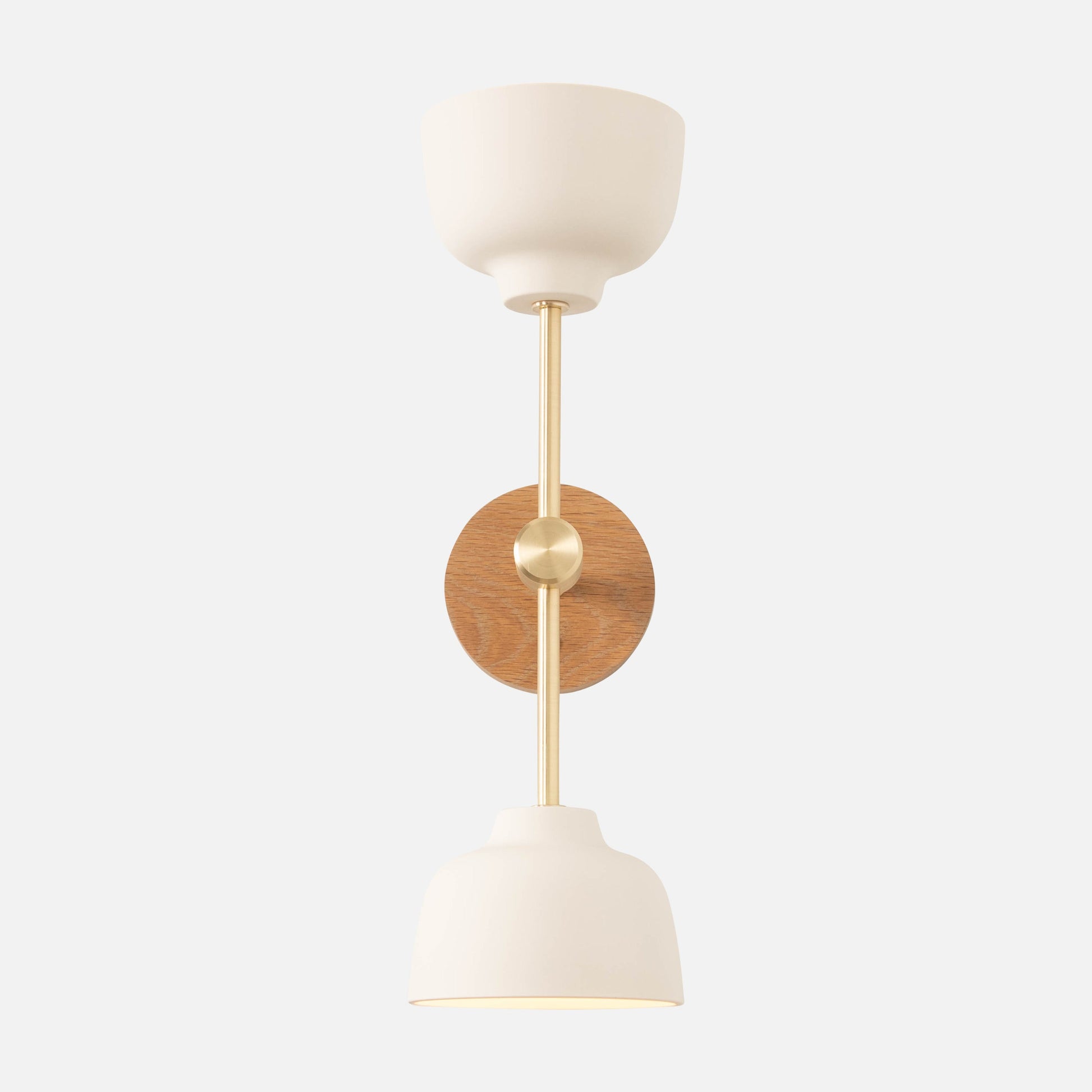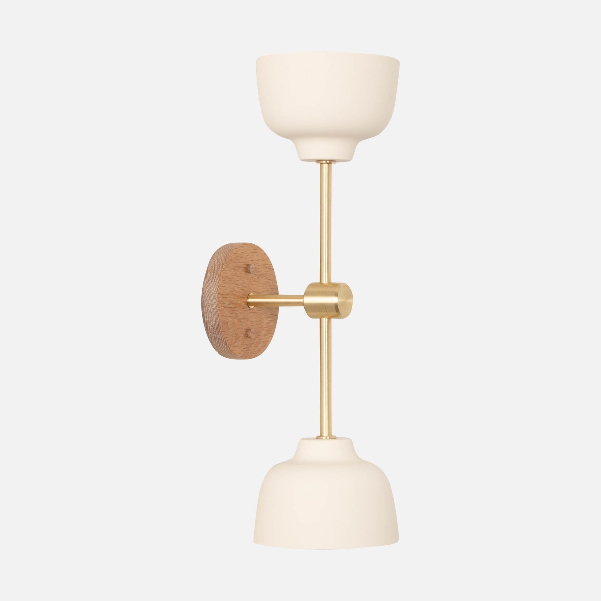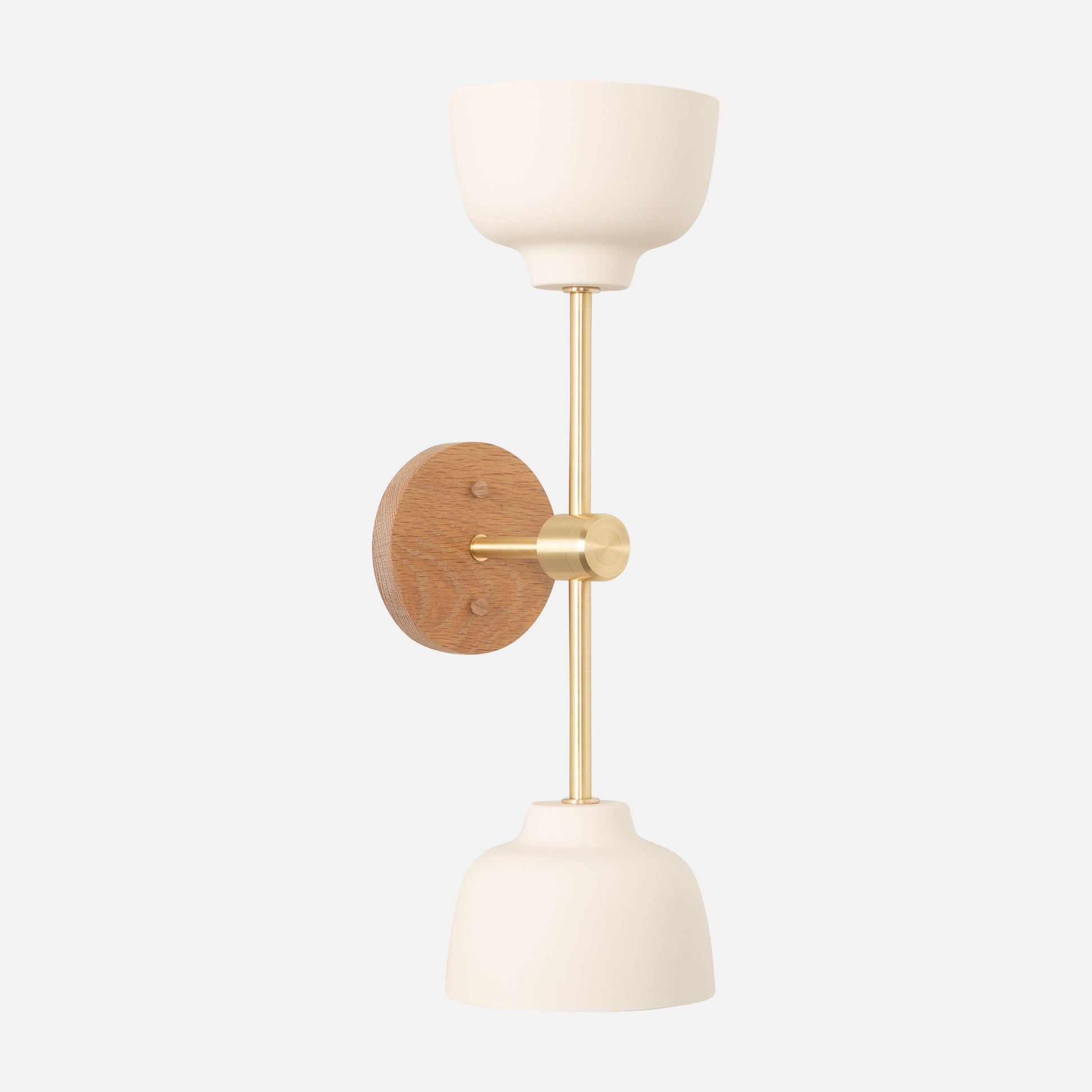 Artisan-made porcelain shades, linear arms and wooden details combine to create this versatile, double wall sconce. The Tucker collection includes sconces, chandeliers and pendants featuring a beautiful mix of materials. Choose your wood, metal and porcelain finish to transform the overall look.