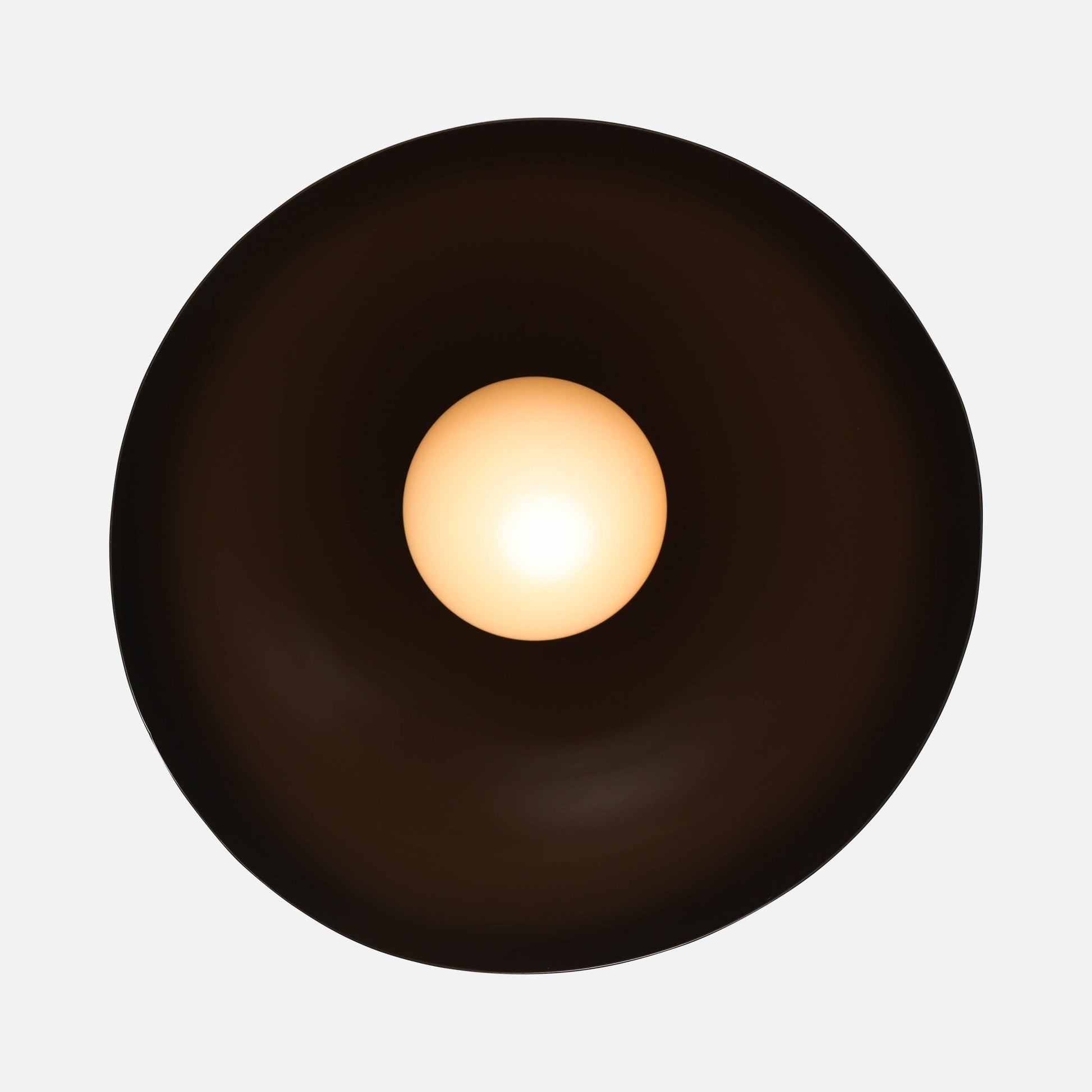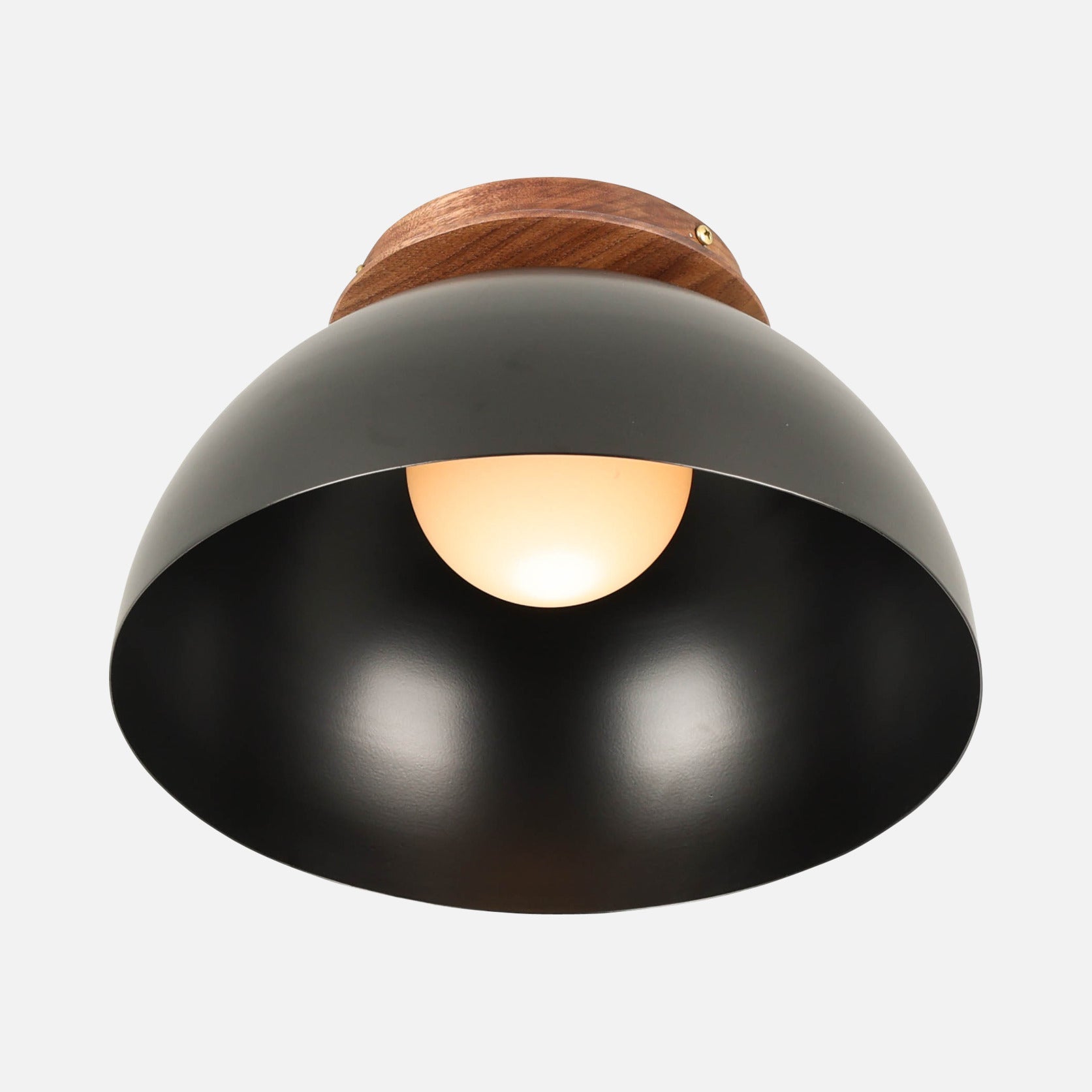 A dome shade housing a glass orb and uniquely patterned wooden canopy combine to create a statement flush mount.