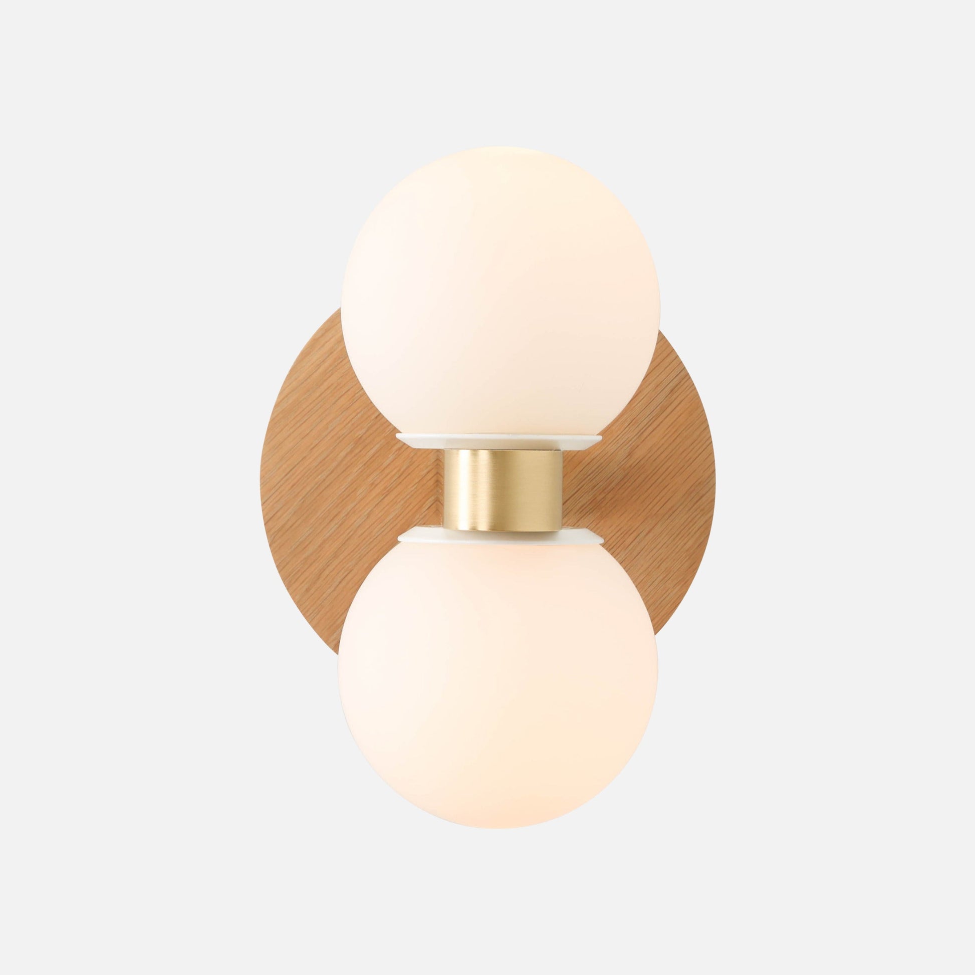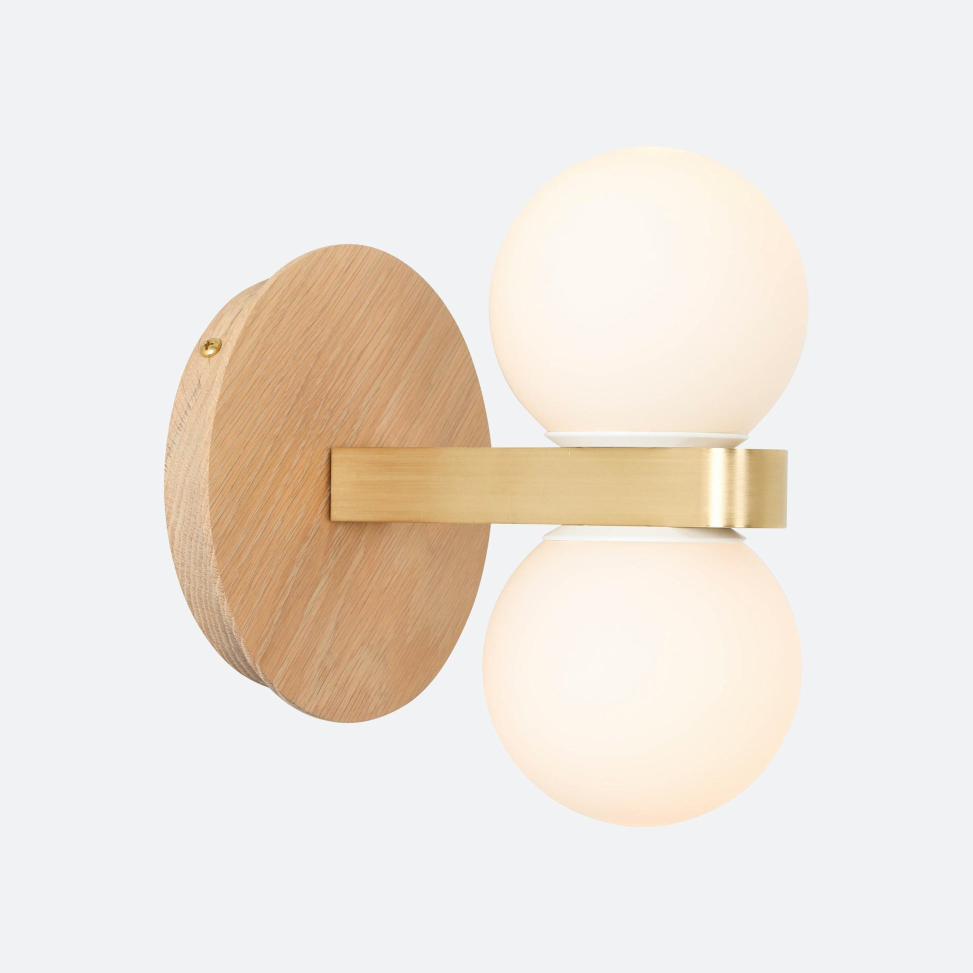 Two delicate glass orbs juxtapose a substantial, sculptural arm to form a striking wall sconce. Choose from our pallet of material combinations for an infinitely versatile look and feel.