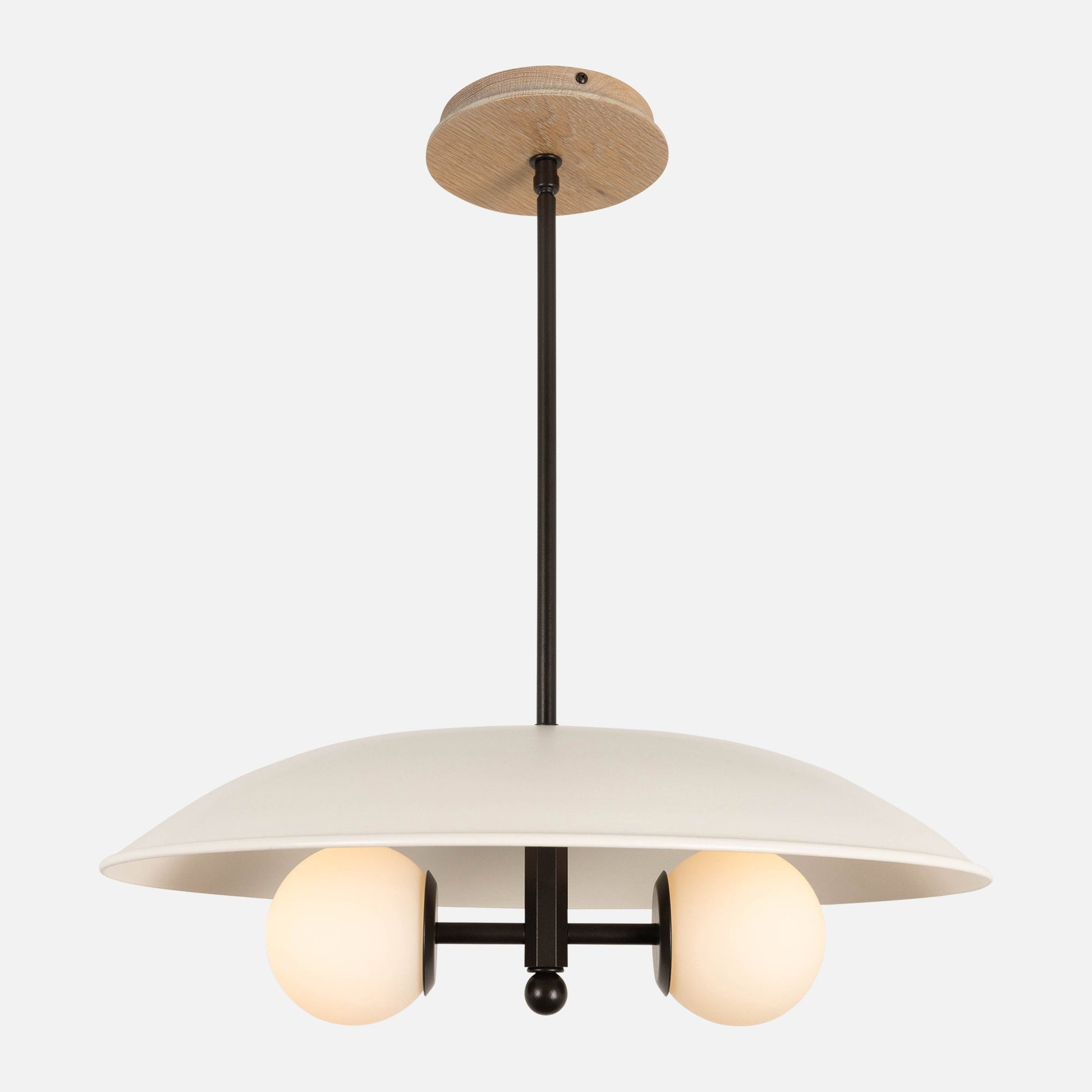 An elegant pendant light with a striking profile, this light features a large, curving shade and other geometric details. The glass globes diffuse the light for a gentle glow.